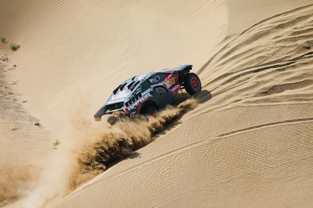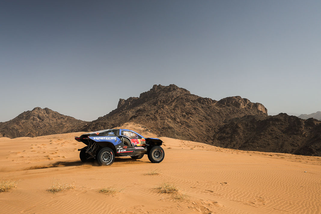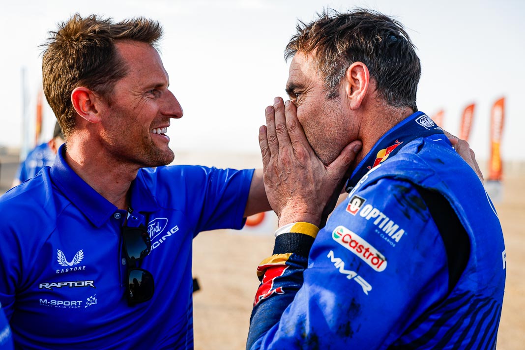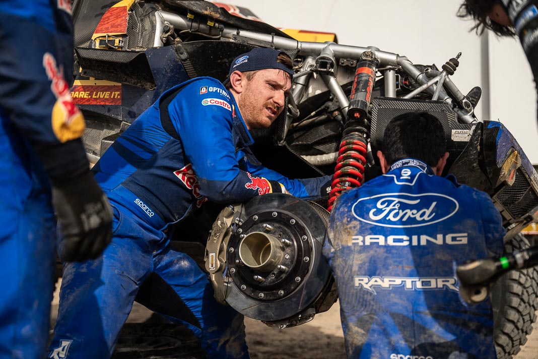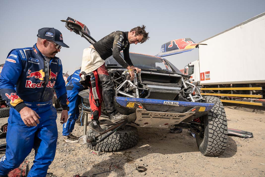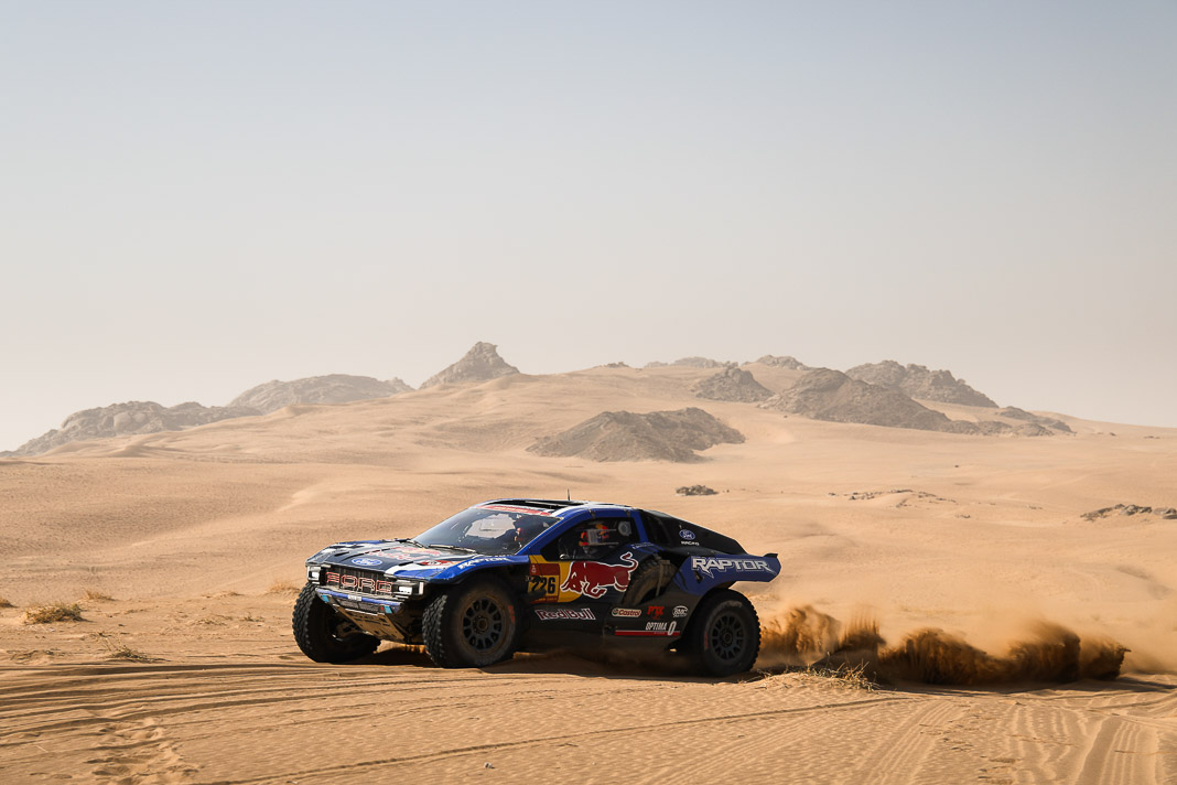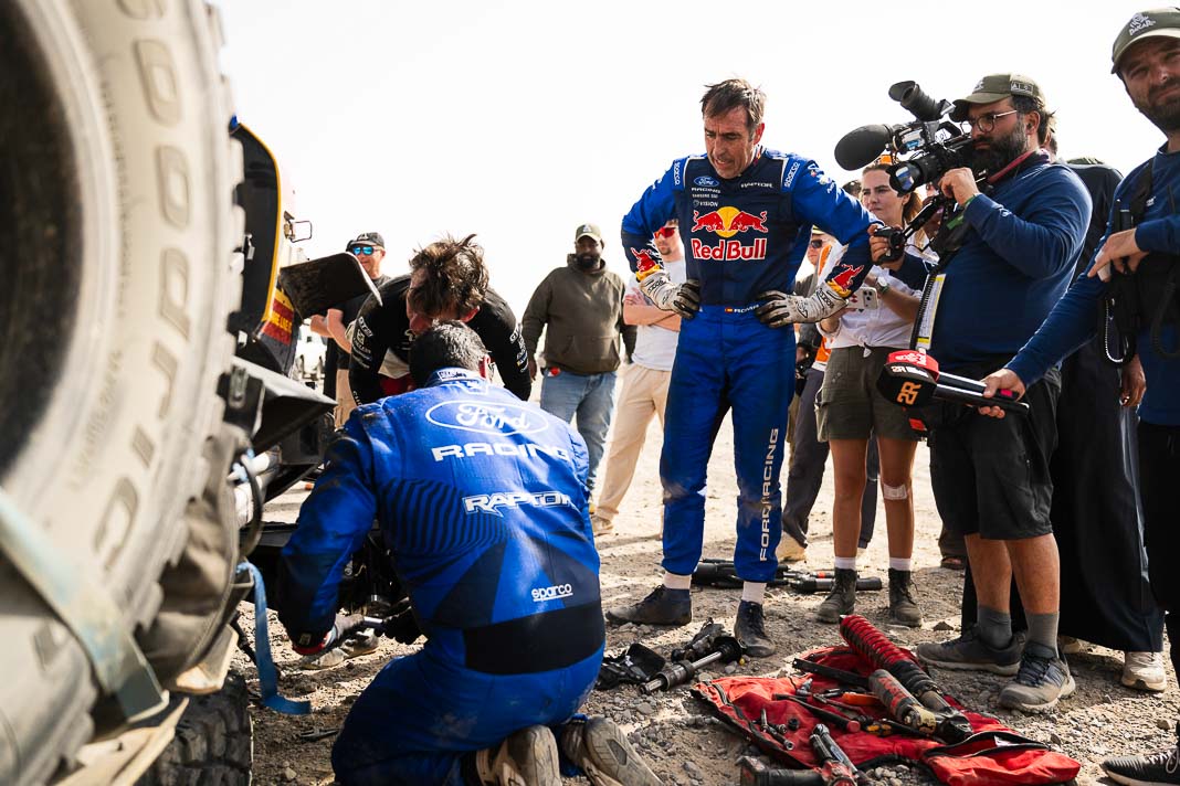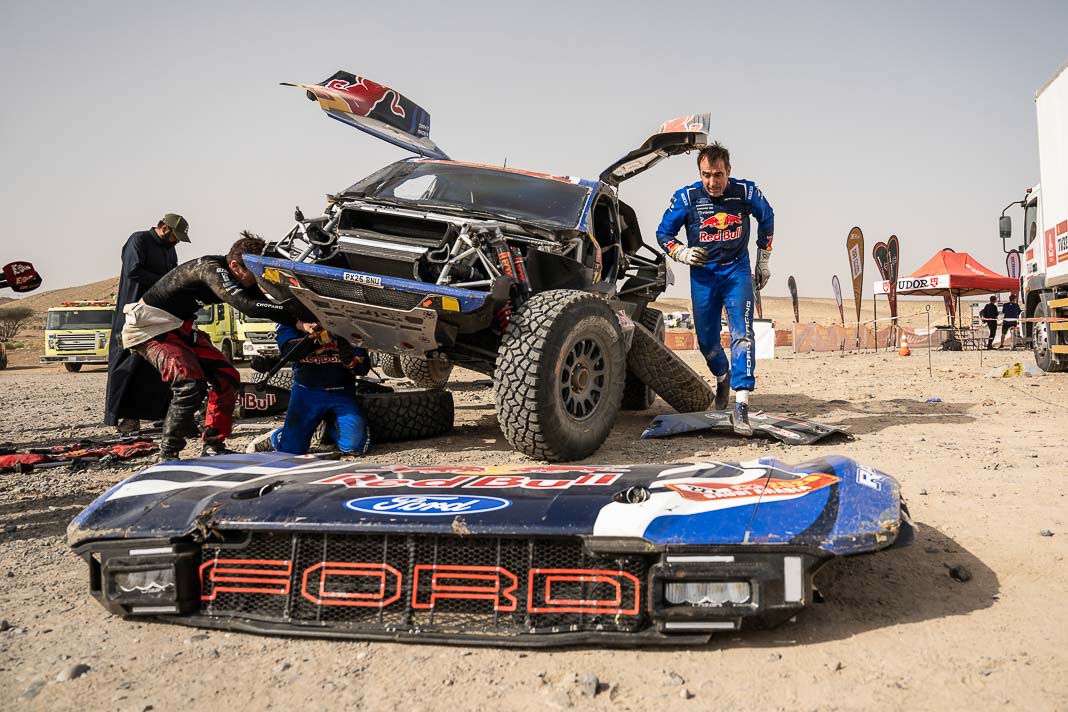 Three Fords stood out yesterday at the end of stage 11: Mattias Ekstrom, Romain Dumas and Carlos Sainz, which was ideal this morning for Nani Roma, who was second overall with a 10-minute lead over his closest rival, Sébastien Loeb. The Frenchman was the 10th driver to start and so enjoyed an ideal position to hunt down his pray, with the hope of swooping in on the Catalan in the overall rankings to put his Sandrider behind the one driven by Nasser Al Attiyah on the eve of the finish. This fact had not escaped the American constructor’s team, which requested Romain Dumas to park up after the first metres of the special and wait for his team leader, so that he could follow him like his shadow throughout the stage. The Frenchman, driving a privately run Raptor, threw himself into this role up until the finishing line, which Roma crossed on three wheels, with his front axle unit dragging along the ground. After completing the special at 14:01’14’’, Nani had 2 hours 45 minutes to reach the bivouac in Yanbu 183 kilometres away. The Ford teams went about carrying out a ‘transplant’ between the two Raptors, which they completed within an on hour. This left Roma with less than one and a half hours to complete the link route before 16.47. Like in a Hollywood blockbuster, Roma ran out of fuel and had to rely on Laia Sanz towing him to the entrance to the bivouac where he clocked in just one minute late. After a few tears to evacuate the stress, Nani realised he had saved his 2nd place on the podium, in spite of a one-minute penalty. Since good news always comes in batches, before this thrilling finale, Mattias Ekstrom had managed, after opening the special, to finish with a time faster than Loeb’s, placing his Raptor on the overall podium 29 seconds ahead of the Dacia. On returning to the shores of the Red Sea, although they surfed on the razor’s edge, Ford did much better than avoid failure…