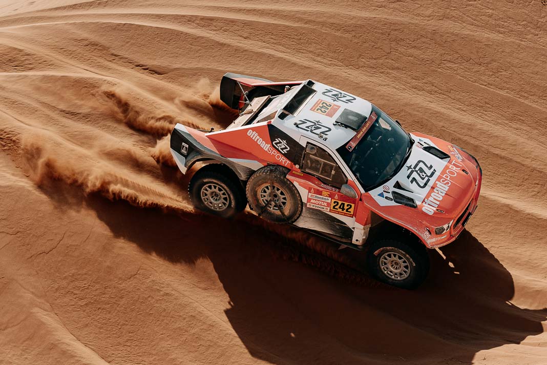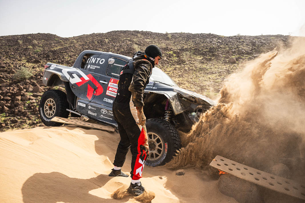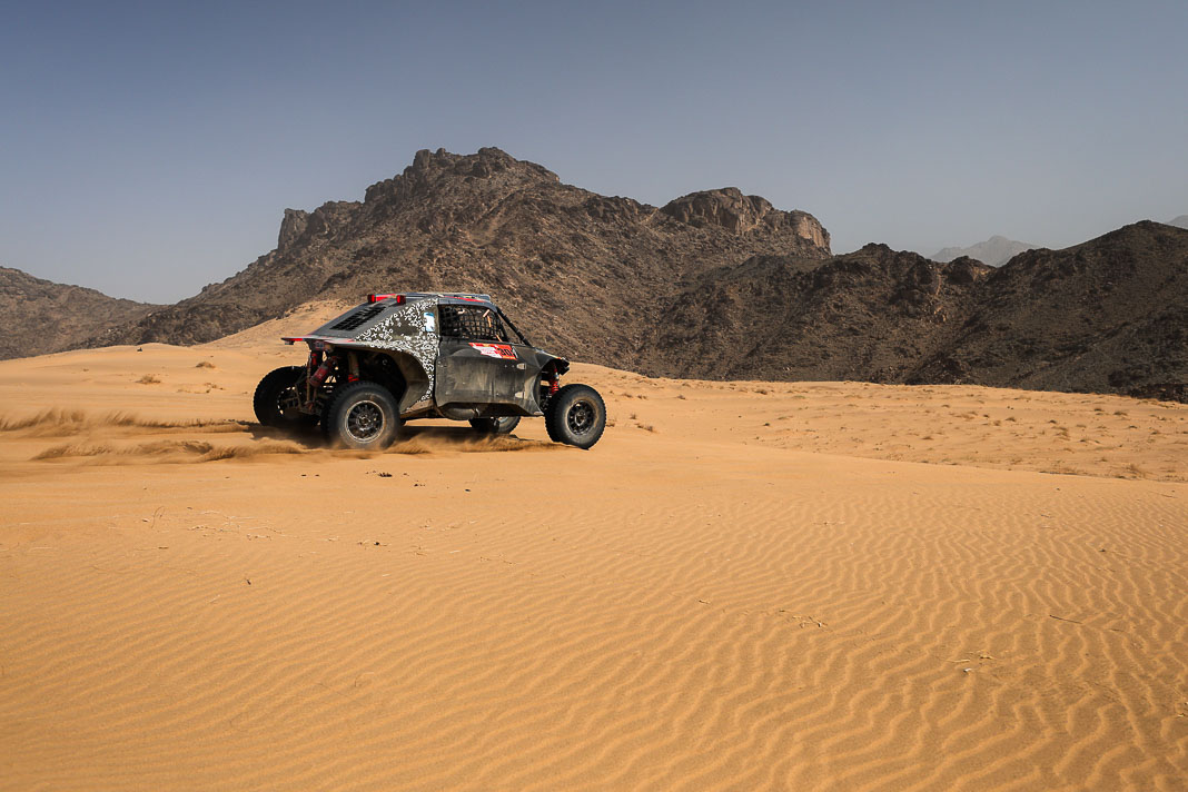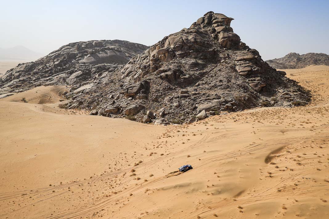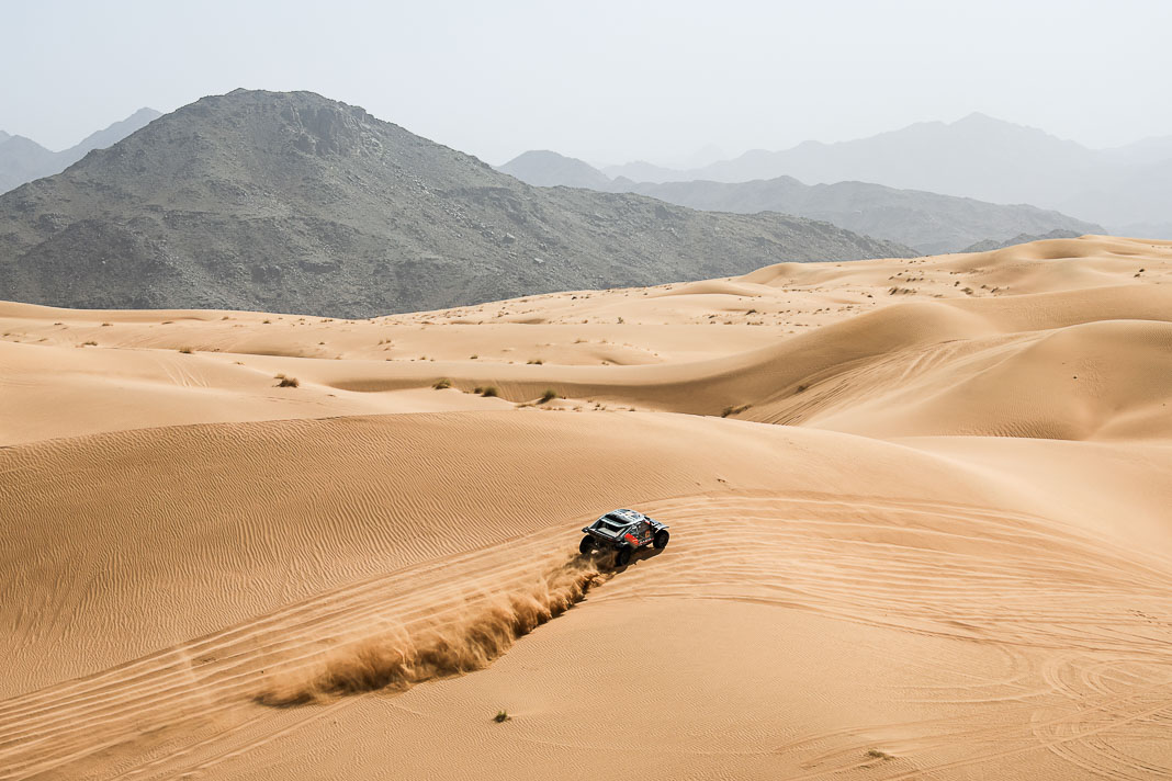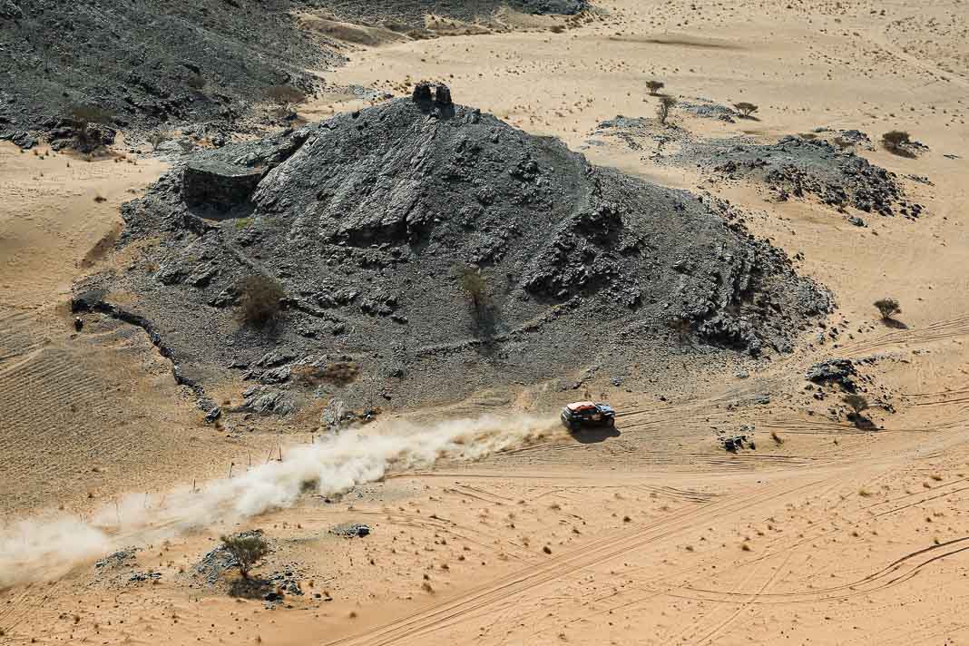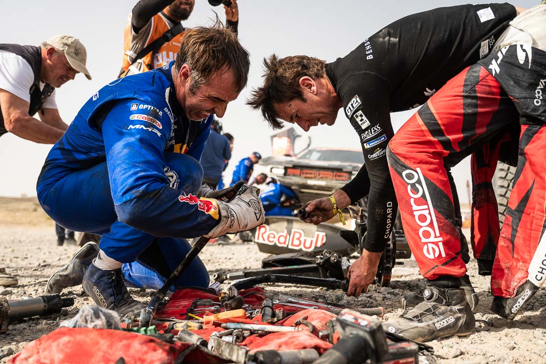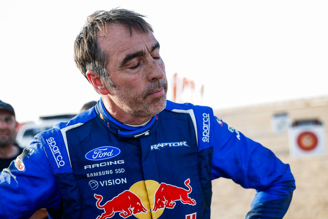 Three Fords stood out yesterday at the end of stage 11: Mattias Ekstrom, Romain Dumas and Carlos Sainz, which was ideal this morning for Nani Roma, who was second overall with a 10-minute lead over his closest rival, Sébastien Loeb. The Frenchman was the 10th driver to start and so enjoyed an ideal position to hunt down his pray, with the hope of swooping in on the Catalan in the overall rankings to put his Sandrider behind the one driven by Nasser Al Attiyah on the eve of the finish. This fact had not escaped the American constructor’s team, which requested Romain Dumas to park up after the first metres of the special and wait for his team leader, so that he could follow him like his shadow throughout the stage. The Frenchman, driving a privately run Raptor, threw himself into this role up until the finishing line, which Roma crossed on three wheels, with his front axle unit dragging along the ground. After completing the special at 14:01’14’’, Nani had 2 hours 45 minutes to reach the bivouac in Yanbu 183 kilometres away. The Ford teams went about carrying out a ‘transplant’ between the two Raptors, which they completed within an on hour. This left Roma with less than one and a half hours to complete the link route before 16.47. Like in a Hollywood blockbuster, Roma ran out of fuel and had to rely on Laia Sanz towing him to the entrance to the bivouac where he clocked in just one minute late. After a few tears to evacuate the stress, Nani realised he had saved his 2nd place on the podium, in spite of a one-minute penalty. Since good news always comes in batches, before this thrilling finale, Mattias Ekstrom had managed, after opening the special, to finish with a time faster than Loeb’s, placing his Raptor on the overall podium 29 seconds ahead of the Dacia. On returning to the shores of the Red Sea, although they surfed on the razor’s edge, Ford did much better than avoid failure…